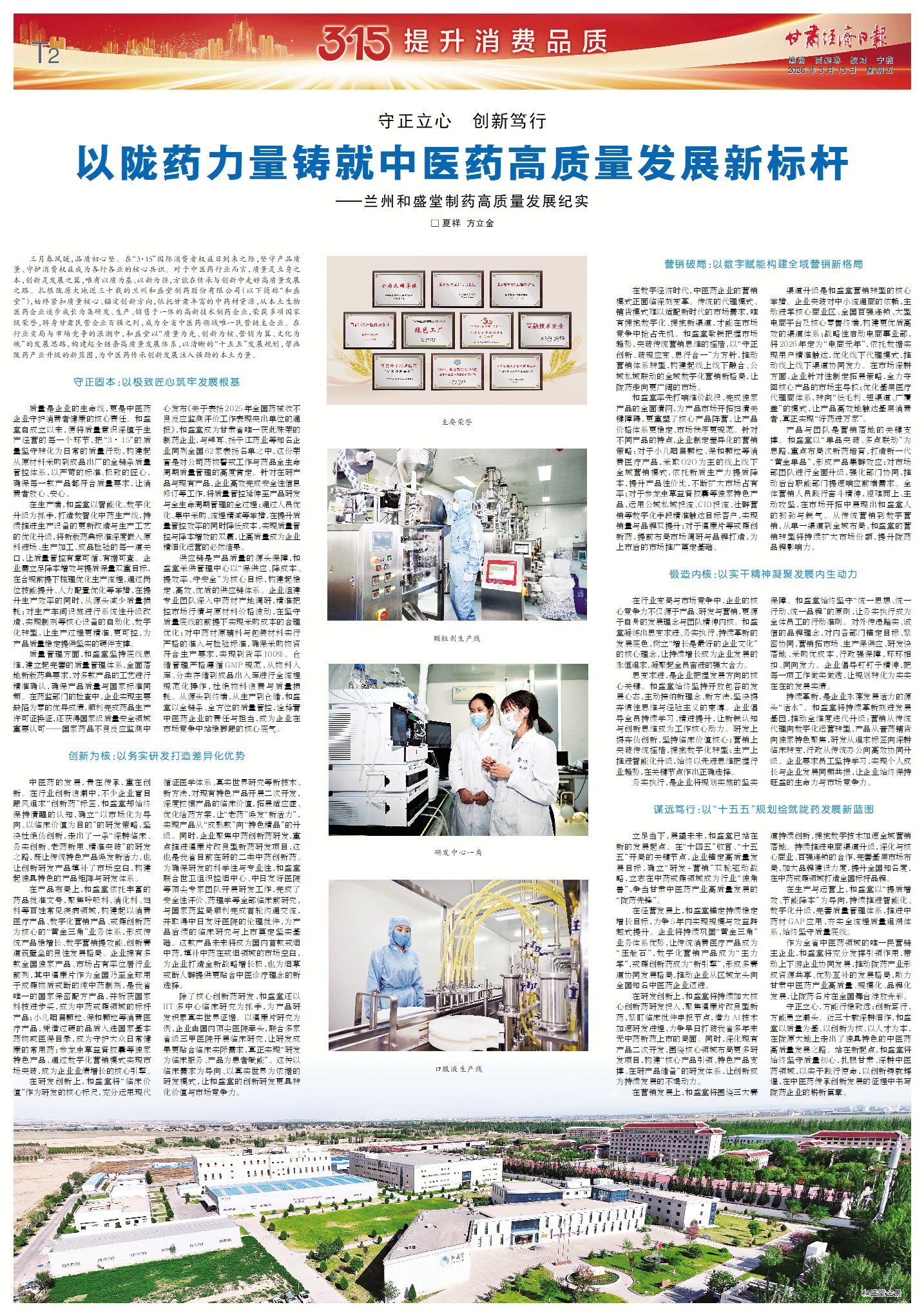 □ 夏祥 方立金 三月春风暖,品质初心坚。在“3·15”国际消费者权益日到来之际,坚守产品质量、守护消费权益成为各行各业的核心共识。对于中医药行业而言,质量是立身之本,创新是发展之翼,唯有以质为基、以新为径,方能在传承与创新中走好高质量发展之路。扎根陇原大地近三十载的兰州和盛堂制药股份有限公司(以下简称“和盛堂”),始终紧扣质量核心、锚定创新方向,依托甘肃丰富的中药材资源,从本土生物医药企业逐步成长为集研发、生产、销售于一体的高新技术制药企业,荣获多项国家级荣誉,跻身甘肃民营企业百强之列,成为全省中医药领域唯一民营链主企业。在行业变局与市场竞争的浪潮中,和盛堂以“质量为先、创新为核、营销为翼、文化为魂”的发展思路,构建起全链条高质量发展体系,以清晰的“十五五”发展规划,擘画陇药产业升级的新蓝图,为中医药传承创新发展注入强劲的本土力量。